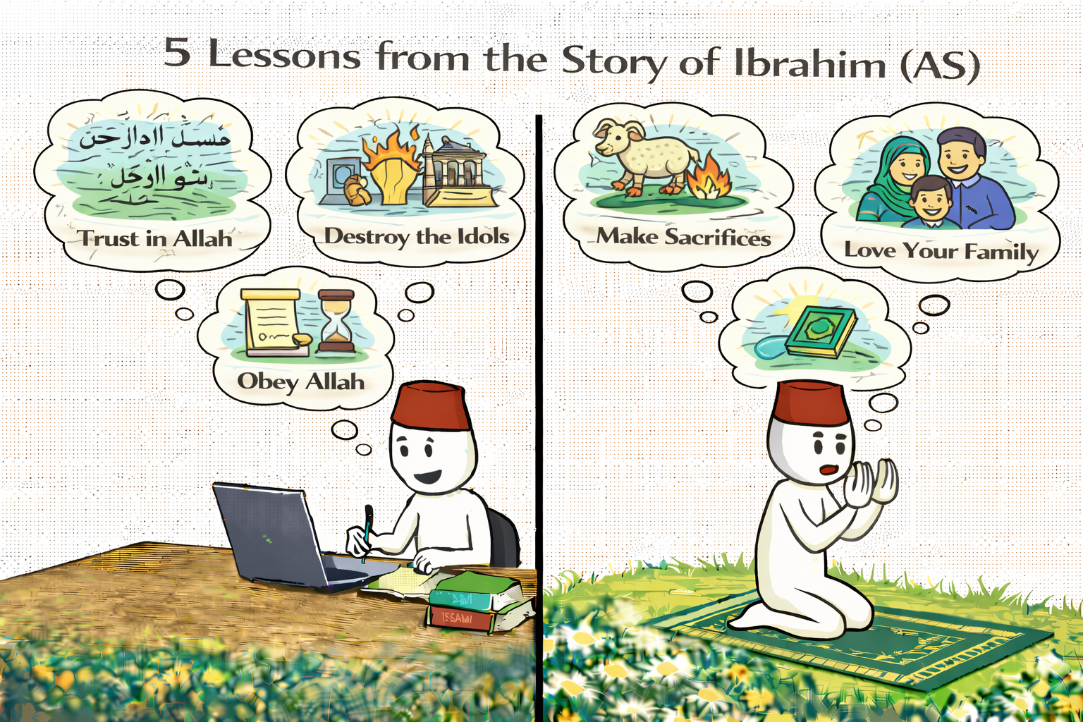 The story of Ibrahim (AS) teaches us to stand for truth, trust Allah completely, sacrifice for His sake, turn to Him in du’a, and build a legacy of faith.