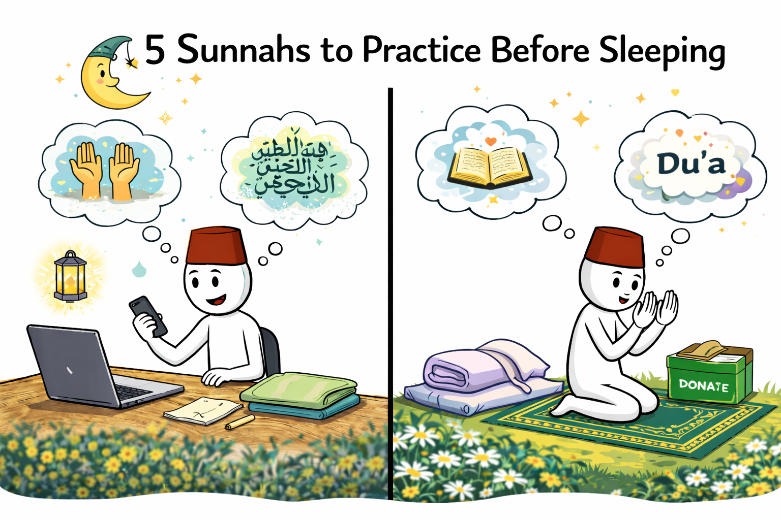 The end of the day is not just a time for rest — it is also an opportunity to reconnect with Allah, reflect on our actions, and prepare our hearts for the night. The Prophet ﷺ taught beautiful Sunnahs that turn the simple act of going to sleep into an act of worship filled with barakah and protection.