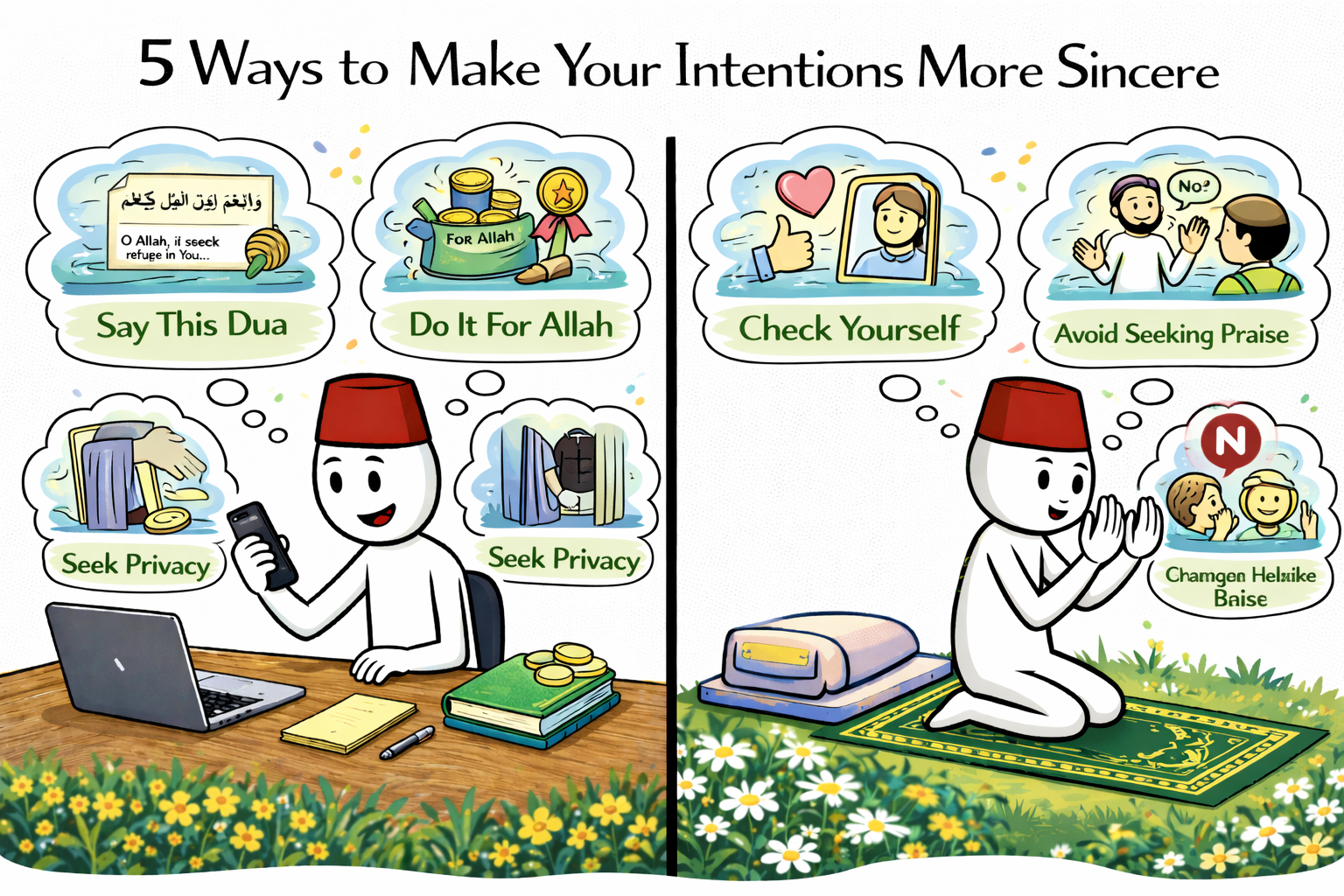 Making your intentions more sincere is a continuous process. It requires awareness, honesty with yourself, and a constant effort to align your heart with the pleasure of Allah.