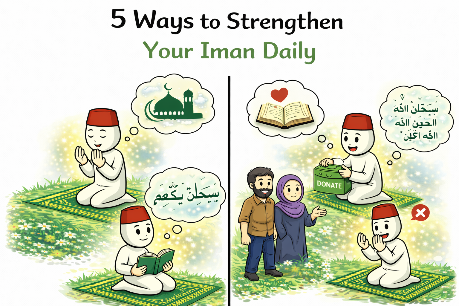 Strengthening iman is a daily effort that grows with consistency and sincerity. Small actions — like praying on time, making dhikr, reading the Qur’an, turning to Allah in du’a, and keeping good company — can transform your spiritual state over time.